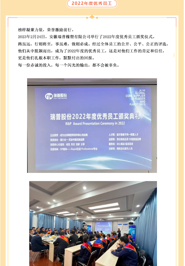 董事長(zhǎng)對(duì)各部門、子公司負(fù)責(zé)人的2022年度總結(jié)及2023年度工作規(guī)劃進(jìn)行分析,對(duì)大家疫情期間的工作予以肯定,并對(duì)其薄弱與不足之處提出改進(jìn)意見。2023年公司將圍繞開拓新市場(chǎng)、項(xiàng)目管理制度、事業(yè)部智能化制造、員工工作能力、公司管理制度等方面進(jìn)行提升。努力為員工提供更好的福利待遇,為客戶提供更優(yōu)質(zhì)的服務(wù),為實(shí)現(xiàn)瑞普成為全球橡塑零部件核心供應(yīng)商的企業(yè)愿景而不懈努力!