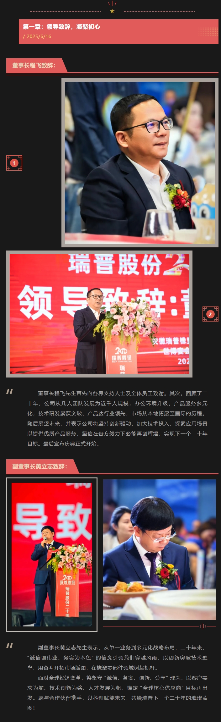 二十載櫛風(fēng)沐雨,二十載砥礪前行。值此安徽瑞普橡塑科技股份有限公司成立二十周年之際,我們滿懷感恩與喜悅,誠(chéng)邀您撥冗出席二十周年慶典活動(dòng),共同見證這一榮耀時(shí)刻,共敘情誼,共謀未來(lái)!